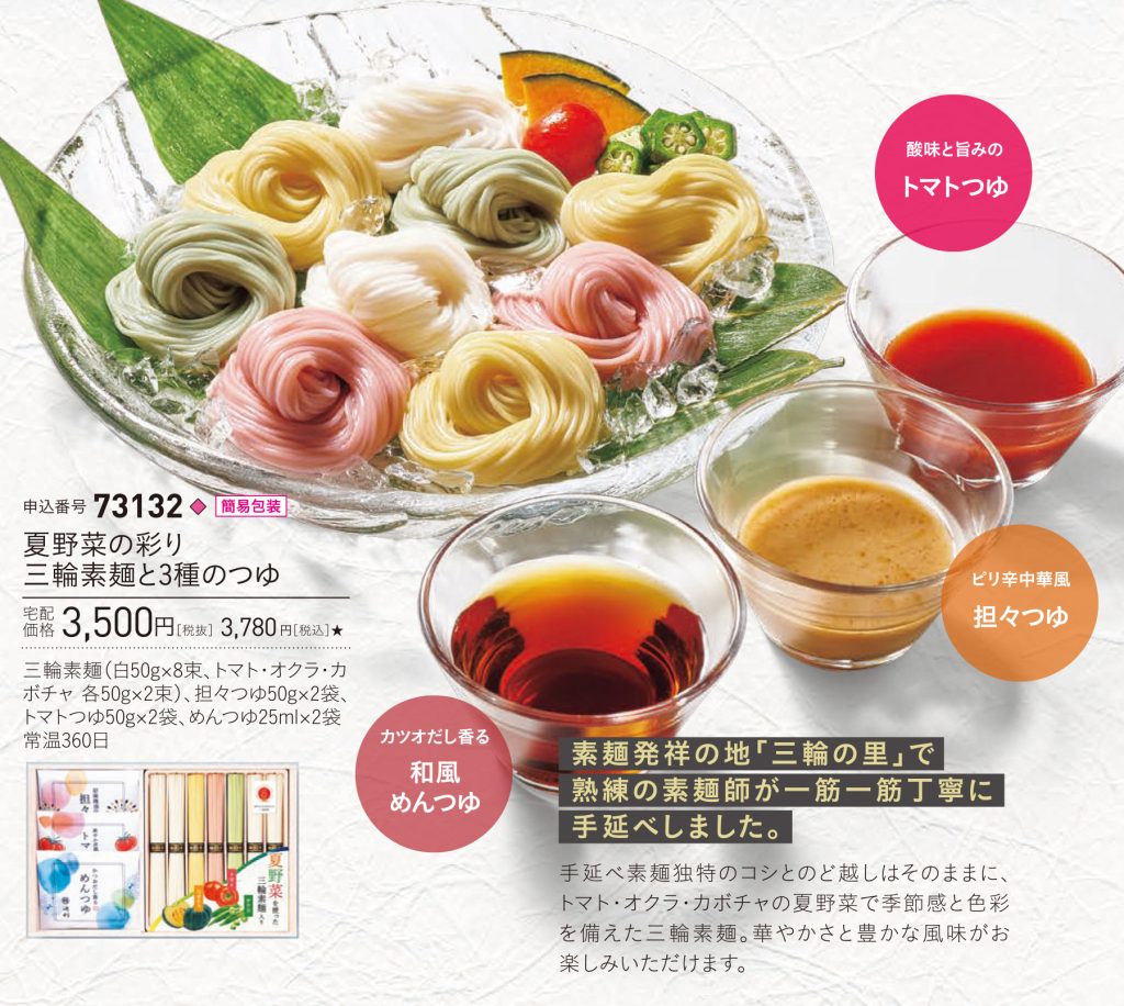 素麺発祥の地「三輪の里」で熟練の素麺師が一筋一筋丁寧に手延べしました。手延べ素麺独特のコシとのど越しはそのままに、トマト・オクラ・カボチャの夏野菜で季節感と色彩を備えた三輪素麺。華やかさと風味がお楽しみいただけます。