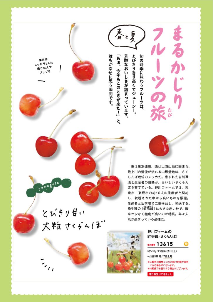 とびきり甘い大粒さくらんぼ。東は奥羽連峰、西は出羽山地に囲まれ、最上川の清流が流れる山形盆地は、さくらんぼ栽培のメッカだ。恵まれた自然環境と生産者の情熱が、おいしいさくらんぼを育てている。野川ファームでは、天童市・東根市の約10 人の生産者と契約し、収穫された中から良いものを厳選。生産者と出荷場で二重検品し、発送する。晩生種の「紅べに秀しゅう峰ほう」は大きな赤い粒で、酸味が少なく糖度が高いのが特長。年々人気が高まっている品種だ。