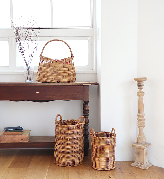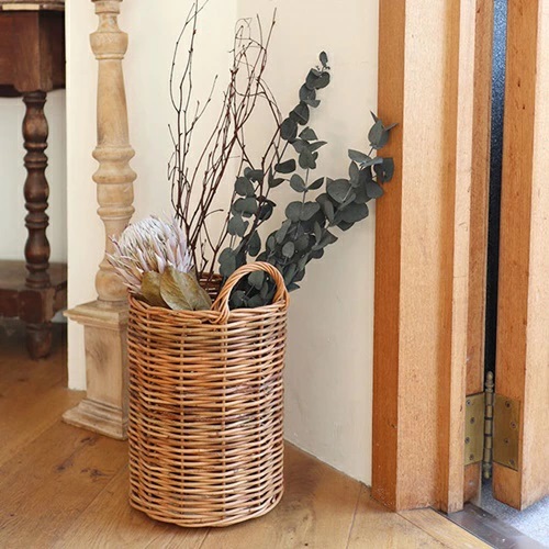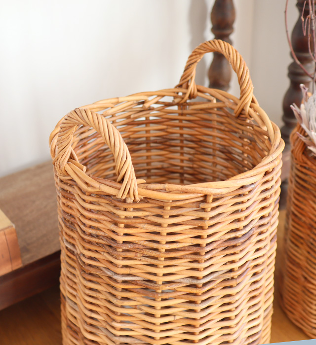 革つきのラタンバスケットで、縦に長いものを入れておくのに最適。