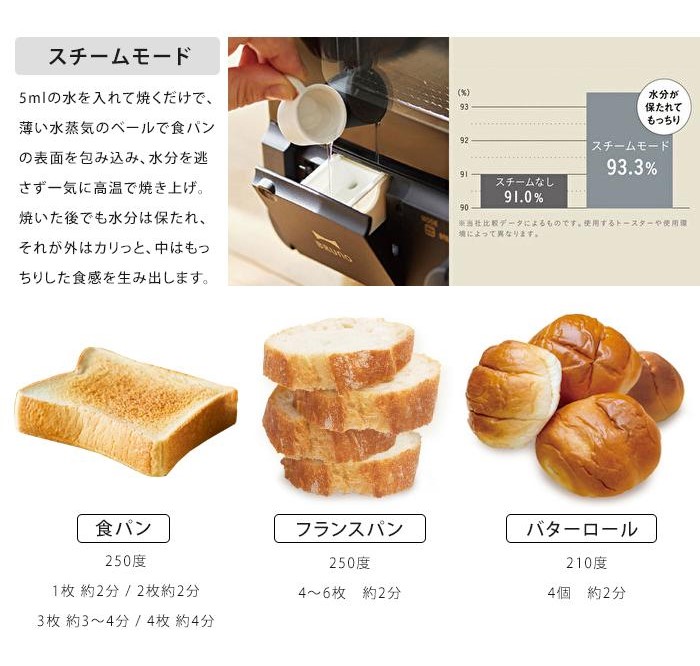 ノーマルモードはお餅やピザ、グラタンなど焼き目をつけたいメニューにピッタリ。スチームモードは5mlのお水を入れ焼くだけ。