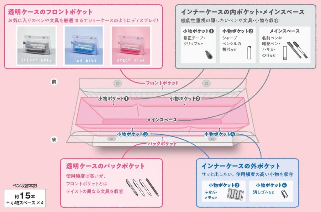 透明ケースには「見せたい」文具を、インナーケースには機能性重視の「隠したい」文具を収容できます。
