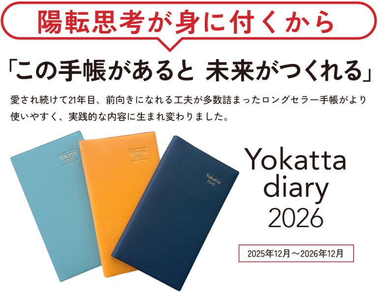 「毎日の積み重ねが未来を作る」 そんな想いを込めて誕生した「Yokatta diary」が、2026年版として新登場。 前向きになれる工夫がたくさん詰まったこの手帳は、毎日を頑張る全ての方におすすめです。 気持ちを整理し、自分の夢や目標に向かって全力で進んでいきたい方は、ぜひ手に取ってみてください。