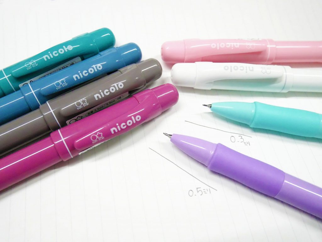 くすみカラーがおしゃれ♪右にひねると0.3mm、左にひねると0.5mmになる便利なシャープペンシル。1本で2種類の芯を使い分けできます。