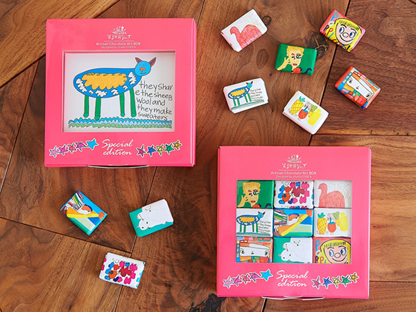 カラフルでポップなデザインを9種類、ピンクのギフトBOXに詰めました。さらにチョコレートを食べ終わると、箱の底にもう一つとっておきのデザインが登場する仕掛けになっており、「素敵なデザイン」と「おいしさ」を詰め込んだアイテムです。