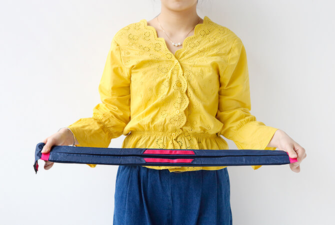 両端を引っ張ると、一気に帯状に。あとはクルクルと丸めるだけで、コンパクトなサイズになります。