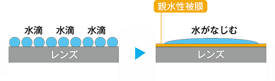 クロスに含まれる成分がレンズ表面に親水性被膜を作ることにより、レンズがくもらなくなります。親水性被膜はその水滴をレンズ表面になじませて、水滴を無くしてくれるのです。