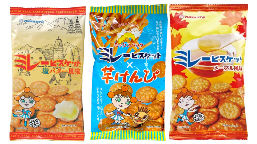 - ラインナップ ミレービスケット×芋けんぴ(ミックス)ミレービスケット×塩バター風味ミレービスケット×メープル風味