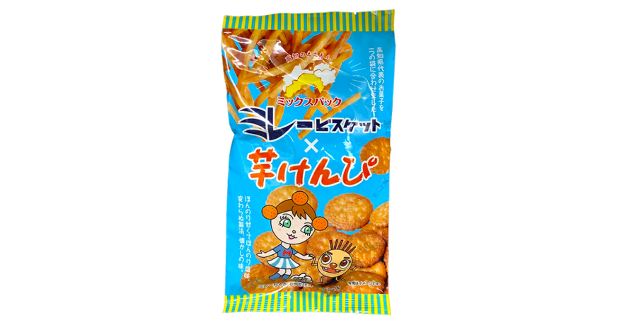 【ミレービスケット×芋けんぴ(ミックス)】 高知を代表するもう一つの名物「芋けんぴ」と夢のコラボ! カリッと香ばしい芋けんぴと、サクッと軽いミレービスケットが 1袋にぎゅっと詰まった贅沢なミックスです。 塩気×甘さ×香ばしさの絶妙バランスで、 食べ始めたら止まらない“危険なおいしさ”。 高知らしさをこれでもかと詰め込んだ、人気No.1フレーバーです。