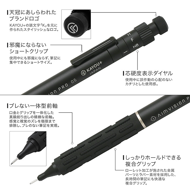 正確さと安定感が求められる製図や筆記。 特にビジネスシーンでは、より高い精度や精密性が求められます。 そんなときにおすすめなのが、カーユプラスのエイムビジョンです。 製図用シャープペンとして開発されたこちらのアイテムは、一般的なシャープペンとは特徴が大きく異なります。 「ワンランク上のシャープペンを探している」 そんな方は、ぜひ当商品をチェックしてみてください。