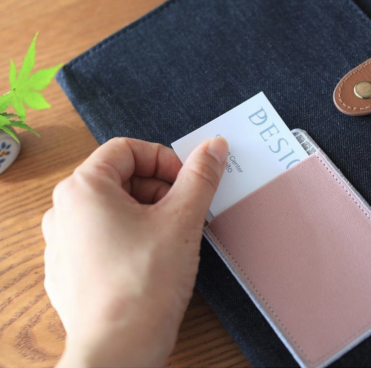 名刺であれば1枚~10枚程度まで入ります。中身が薄くても厚くても中身が落ちないようにするため、MIDORIが何度も試作を重ね、絶妙なホールド感を実現しました。名刺1枚でも滑り落ちたりしないんですよ♫