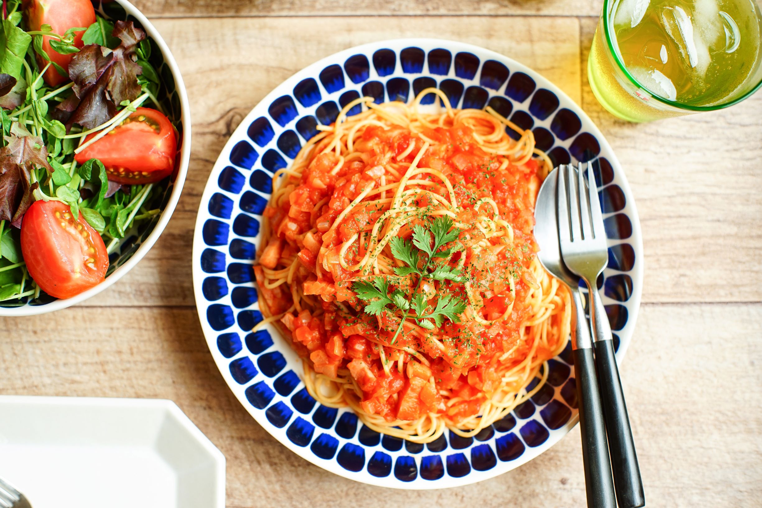 今回は、便利なトマト缶を使って作る「トマトソース」をご紹介。真っ赤なソースをパスタに絡ませ、盛り付けにはフィンランドのブランド『ARABIA(アラビア)』のプレートを使用。