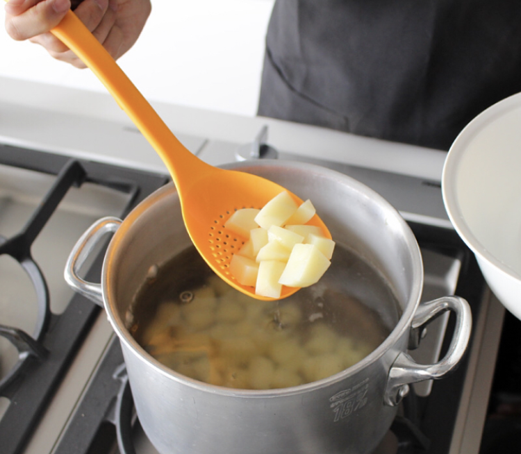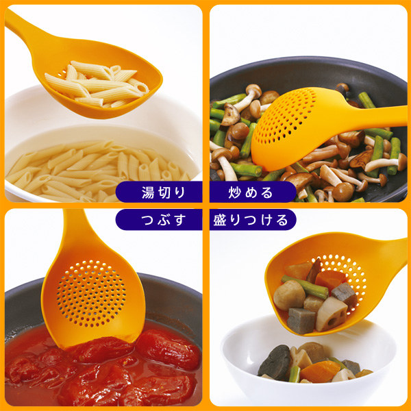 茹でた野菜やマカロニなどをすくったり、とろみの付いた中華料理を混ぜながら炒めたり、煮物を盛り付けたり。