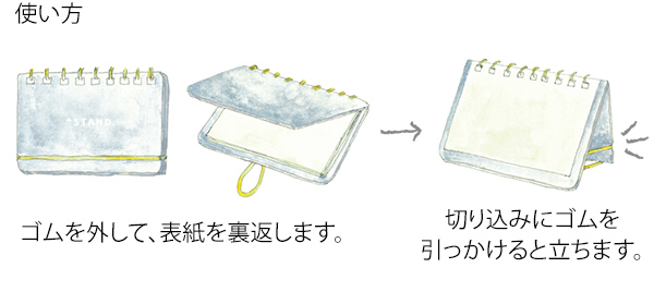 ノートについているゴムバンドをくるっと角に引っかければ、簡単に立つノートの完成。