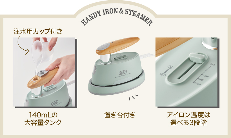 アイロン温度は3段階から選ぶことができ、衣類の洗濯表示に合わせて設定できますよ。