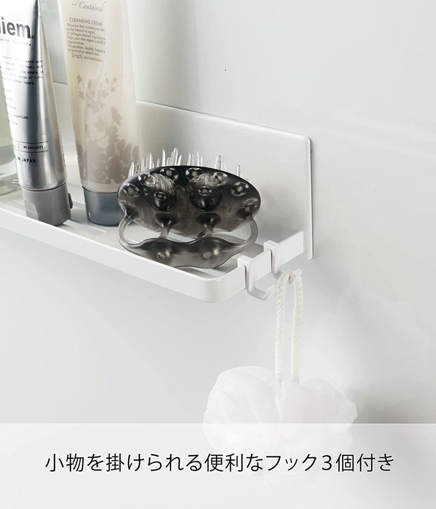 フックが3つ付いているので、ぶら下げておきたいボディタオルやボディブラシなどの小物類もスッキリ。